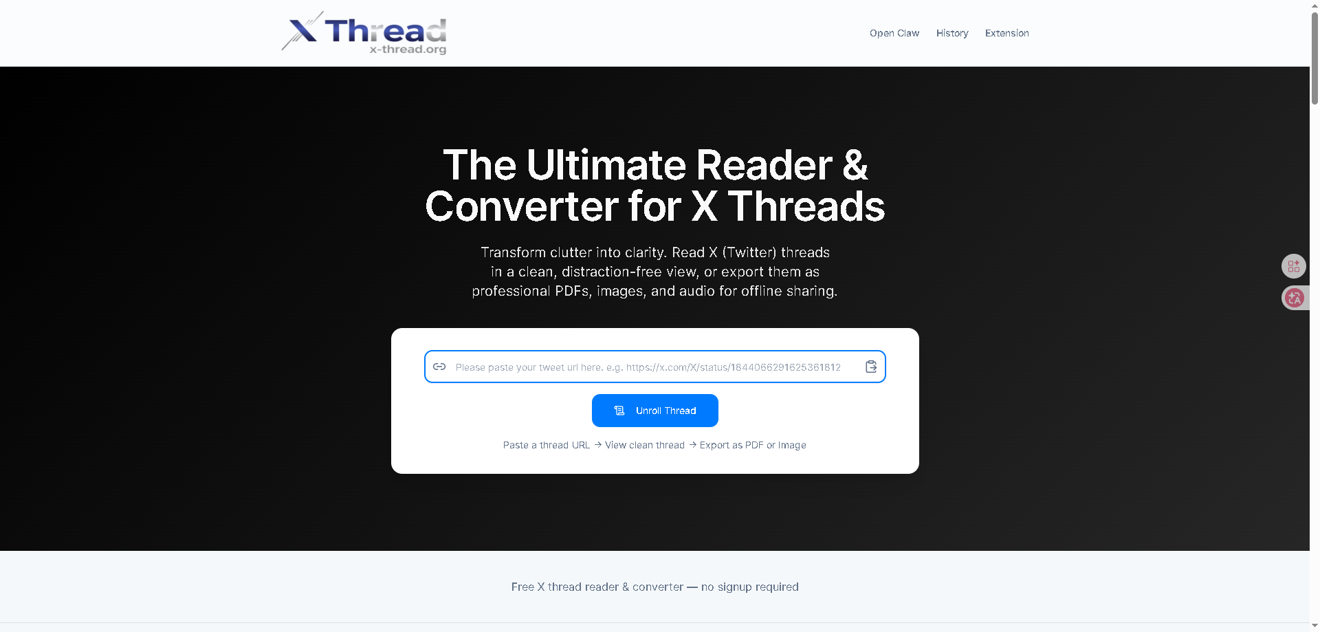 Convert X threads into clean, readable PDFs. Paste a thread link, view it without distractions, and download or share instantly. Free and fast.